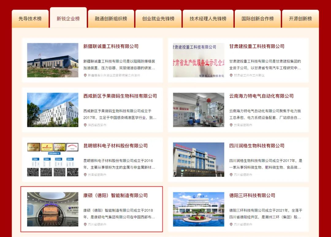 近日,在2023“科創中國”年度會議上,中國科協正式發布了2022年“科創中國”系列榜單。康碩(德陽)智能制造有限公司入選“科創中國”新銳企業榜。