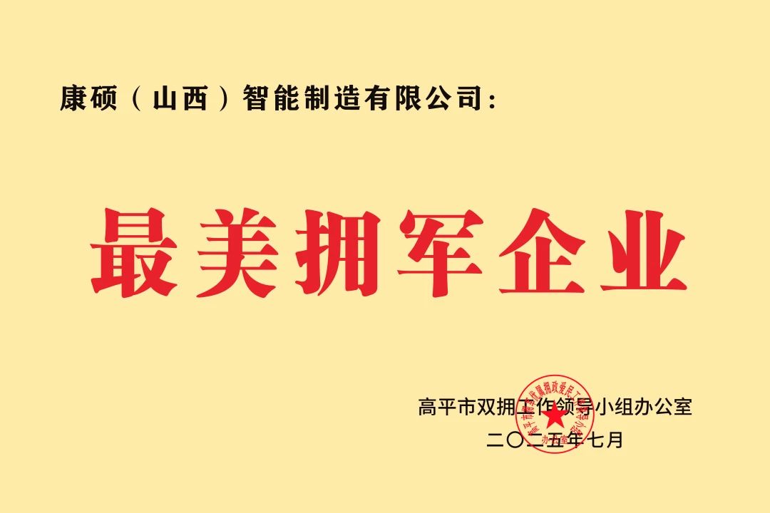 在中國人民解放軍建軍98周年之際,康碩集團榮獲“最美擁軍企業”稱號,這一榮譽由高平市雙擁工作領導小組辦公室頒發,以表彰公司在支持國家智能裝備建設和擁軍優屬工作中的杰出貢獻。