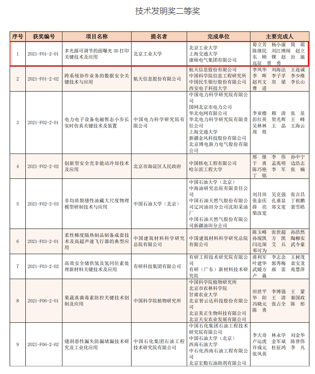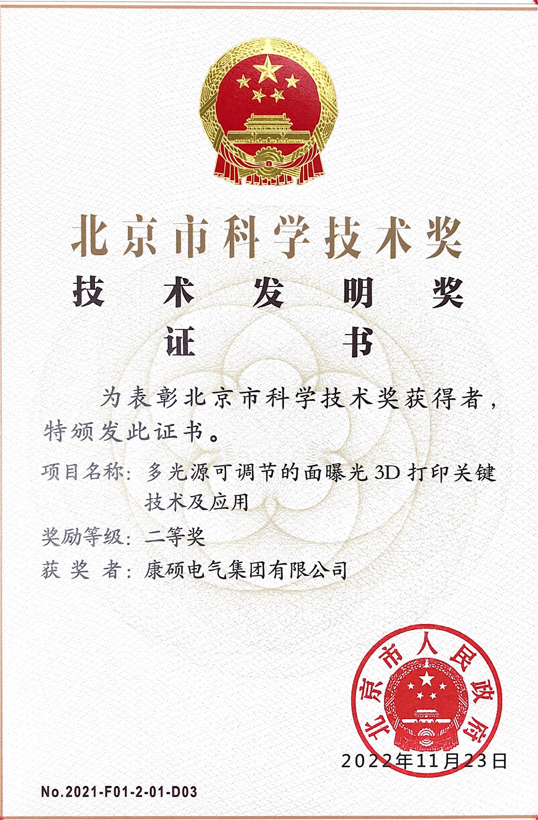 2022年11月23日,北京市人民政府發布,根據《北京市科學技術獎勵辦法》及《北京市科學技術獎勵辦法實施細則》有關規定,由北京工業大學牽頭,上海交通大學、康碩電氣集團有限公司聯合申報的“多光源可調節的面曝光3D打印關鍵技術及應用”項目榮獲北京市科學技術發明獎二等獎。