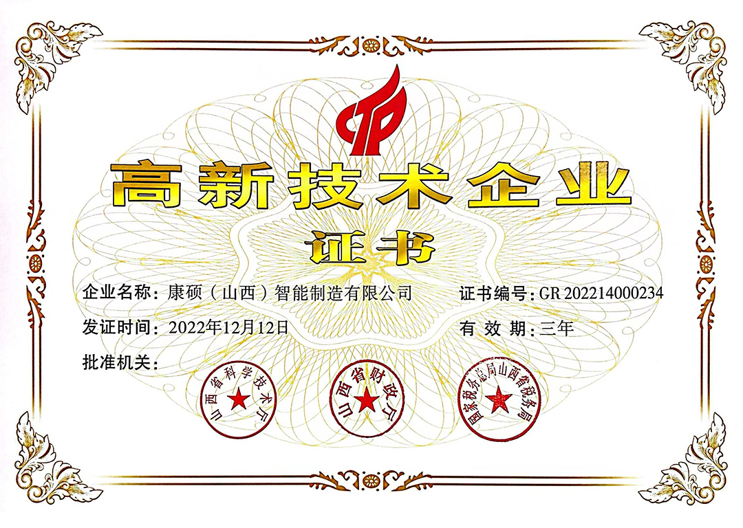 3月29日,康碩(山西)智能制造有限公司(以下簡(jiǎn)稱“山西康碩”)在高平市智創(chuàng)城參加2023年高新技術(shù)企業(yè)授牌儀式,儀式上,宣讀了《關(guān)于獎(jiǎng)勵(lì)2022年創(chuàng)新型科技企業(yè)的決定》。康碩(山西)智能制造有限公司順利通過(guò)山西省科學(xué)技術(shù)廳、山西省財(cái)政廳、國(guó)家稅務(wù)總局山西省稅務(wù)局等部門的聯(lián)合評(píng)審驗(yàn)收,被正式認(rèn)定為“高新技術(shù)企業(yè)”,榮獲《高新技術(shù)企業(yè)證書(shū)》(證書(shū)編號(hào):GR 202214000234)。
