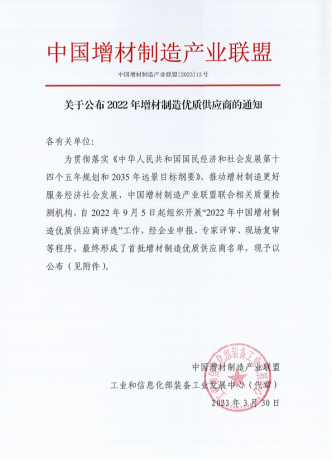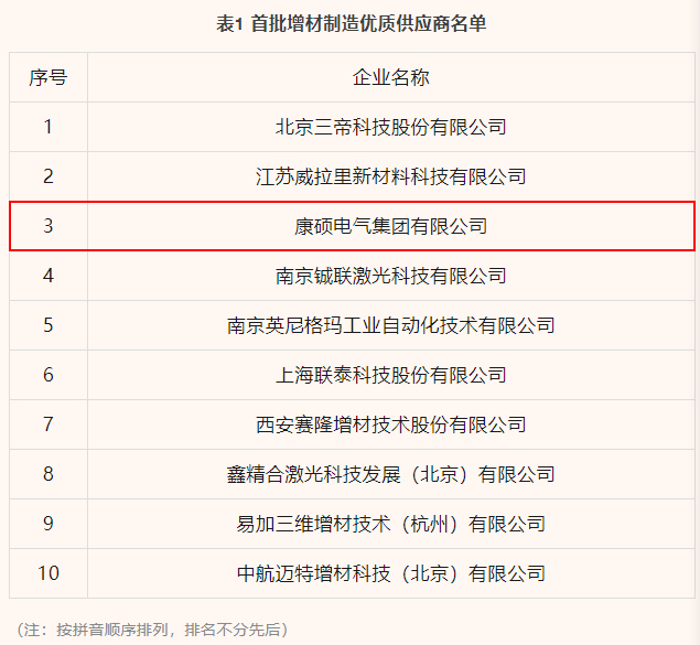 4月6日,中國增材制造產業聯盟發布,為貫徹落實《中華人民共和國國民經濟和社會發展第十四個五年規劃和2035年遠景目標綱要》要求,推動增材制造更好服務經濟社會發展,中國增材制造產業聯盟聯合相關質量檢測機構組織開展2022年中國增材制造優質供應商評選工作,經企業報名、專家評審、現場復審等程序,康碩電氣集團有限公司成功入選2022年首批增材制造優質供應商名單。