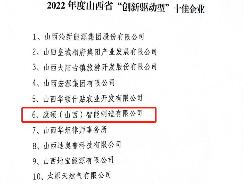 近日,根據山西企聯[2023]6號文件精神,通過山西企聯系統和山西省生產力學會的組織推薦及企業自愿申報,由山西企聯、山西省生產力學會組織有關專家對企業申報的技術創新成果、管理創新成果、專利發明與應用以及企業研發費用占銷售收入的比例,科研人員占職工總數的比例等方面進行逐項排序分析和綜合研判,康碩(山西)智能制造有限公司(以下簡稱“山西康碩”)榮獲2022年度山西省“創新驅動型”十佳企業。
