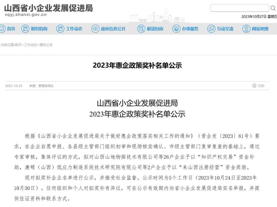 近日,山西省小企業(yè)發(fā)展促進(jìn)局對(duì)2023年惠企政策獎(jiǎng)補(bǔ)名單進(jìn)行了公示。其中,擬對(duì)我司“康碩(山西)低應(yīng)力制造系統(tǒng)技術(shù)研究院有限公司”予以“來山西注冊(cè)經(jīng)營”資金獎(jiǎng)勵(lì)。