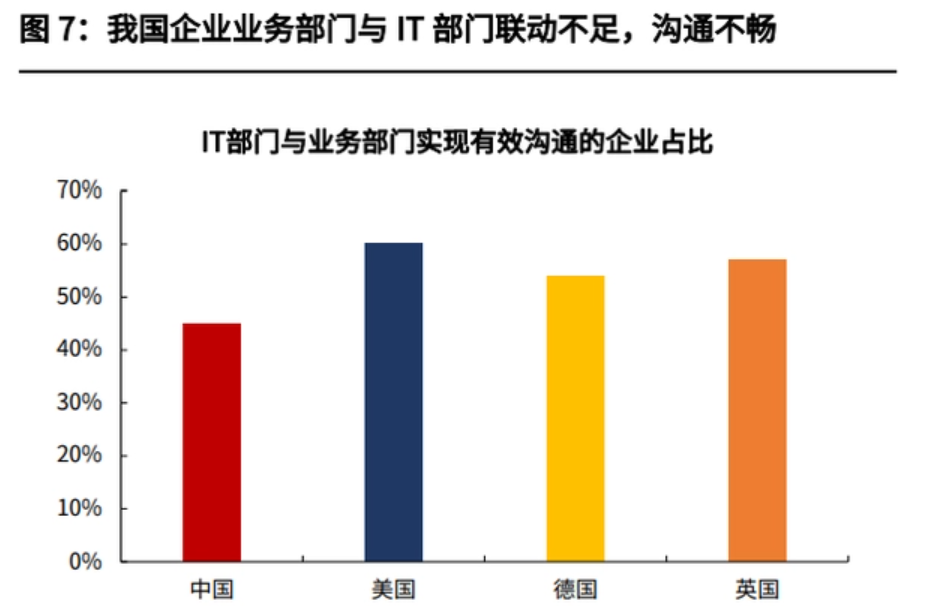 由于智能制造的推進涉及生產、銷售和 IT 等多部門,部門間的信息溝通效率和通力合作程度,是充分挖掘企業實際需求,并決定企業數字化改造發力方向和 實際效果的重要因素。在這一方面,雖然各國都多少存在業務部門和 IT 部門溝通不暢的問題,但我國相較于發達國家仍有差距。這一痛點問題的解決不僅需要自上而下的戰略設計和組織變革,也需要企業內部基礎設施的有力支撐。在企業內部基礎設施方面,各國數字化改造的過程中,都多少受到了原有 IT 基礎設施水平不足的限制,而我國企業在這一方面遇到的阻礙更大。一方面,企業生產、采購、財務等系統間數據缺乏互通互聯性,導致信息孤島問題的產生,因此各部門之間的信息溝通不暢不僅是組織架構的欠缺,也是客觀支撐條件的不足。另一方面,企業內部流程、資源和培訓的缺失,也使得技術引入易而見效難, 轉型開啟易而落實難。企業在購置信息系統和設備時,往往缺乏對自身實際條件的充分考量,也缺乏對項目實施難度和周期的足夠認知。轉型不見效往往并非因為技術無用,而是源自基礎不牢。