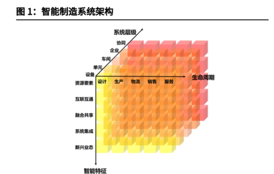 廣闊的發展前景,曲折的前進道路。根據《智能制造發展規劃(2016-2020 年)》,智能制造是基于新一代信息通信技術與先進制造技術深度融合,貫穿于設計、生產、管理、服務等制造活動的各個環節,具有自感知、自學習、自決策、自執行、自適應等功能的新型生產方式。然而,上述內容只描述了智能 制造廣闊的發展空間和其所引領的深刻變革,在智能制造的實際落地過程中, 仍需分步驟分階段,解決諸多共性和特性問題。具體來看,智能制造由自動化、數字化、網絡化和智能化四大要素組成。自動化是實現流程標準化、信息可采集的技術基礎;數字化是充分利用數據要素, 實現企業全流程再造的必經之路;網絡化是推動端到端全場景互聯,重塑價值鏈環節的連接紐帶;智能化是轉向智能決策支持,賦能產業革命的最終目標。在智能制造由愿景變為現實的過程中,上述要素的演進并沒有絕對的先后順序,而是需要相輔相成、螺旋前進。其中,為實現自動化所需的軟硬件升級, 是相對容易滿足的必要條件,而為完成數字化轉型所必須實現的企業再造,是當前難點和成敗關鍵。
