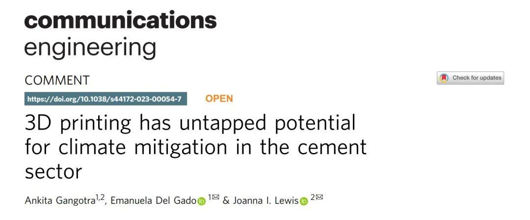 在過去的幾十年里,全球人口一直在穩步增長,這意味著房屋等建筑數量也在隨之攀升。住宿建設必不可少的是水泥產品(包括水泥和混凝土),這是當今使用最廣泛的資源之一。根據聯合國經濟和社會事務部(人口司)進行的預測未來幾年世界人口的研究報告顯示:到2060 年,這個星球上的人口預計將超過100億。考慮到目前約占二氧化碳排放總量8%的水泥生產,建筑行業的排放量可能會進一步增加。因此,由 Ankita Gangotra、Emanuela Del Gado 和 Joanna I. Lewis 組成的研究團隊一直在研究使用水泥和相關材料進行3D打印的可能性,他們都在美利堅合眾國喬治城大學工作氣候保護。關于這個令人興奮的建筑行業水泥3D打印項目,您可以在發表在《Commun Eng》期刊上的題為“3D printing has untapped potential for climate mitigation in thecement sector”研究論文中找到進一步信息。