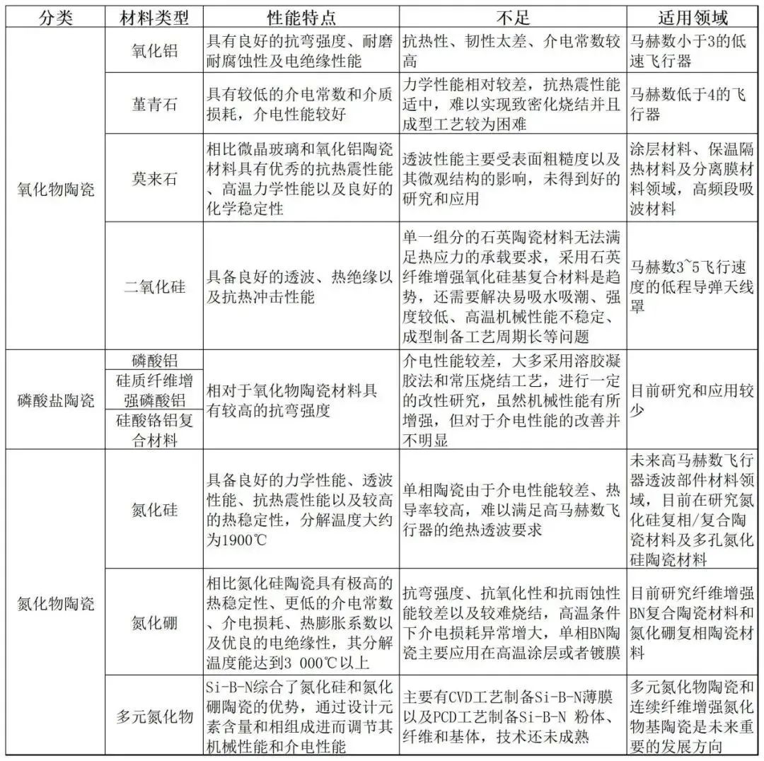 國內在3D打印材料方面已開展了大量的研究,但主要集中在氧化鋁 (Al2O3)、氧化鋯(ZrO2)、硅酸鈣(CaSiO3)、碳化硅(SiC)等非透波陶瓷材料。對于高溫透波陶瓷材料的研究主要集中在氧化物陶瓷、磷酸鹽陶瓷和氮化物陶瓷三個方面,但對于3D打印透波陶瓷材料的研究較少。
